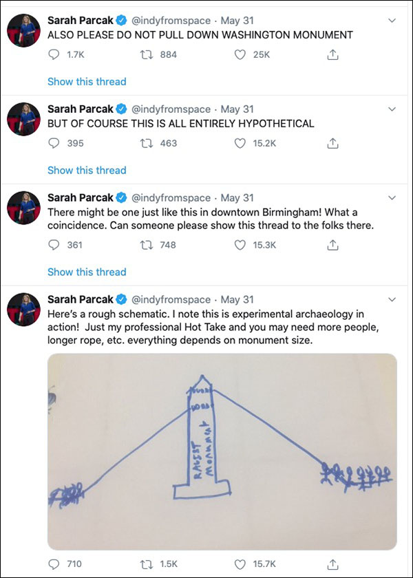 How coy. It's possible she doesn't really think the Washington Monument should be toppled, in which case her committment to the cause can be questioned. (The first wave of the revolution is useful for identifying the people who have to be stuffed in the tumbrel for the second phase.) She might even think it's funny that someone would want her expelled because she didn't want the Washington Monument toppled. If it was, she'd probably give us a lecture about the colonialism inherent in the craze for Egyptian obelisks, and find it all a teachable moment.