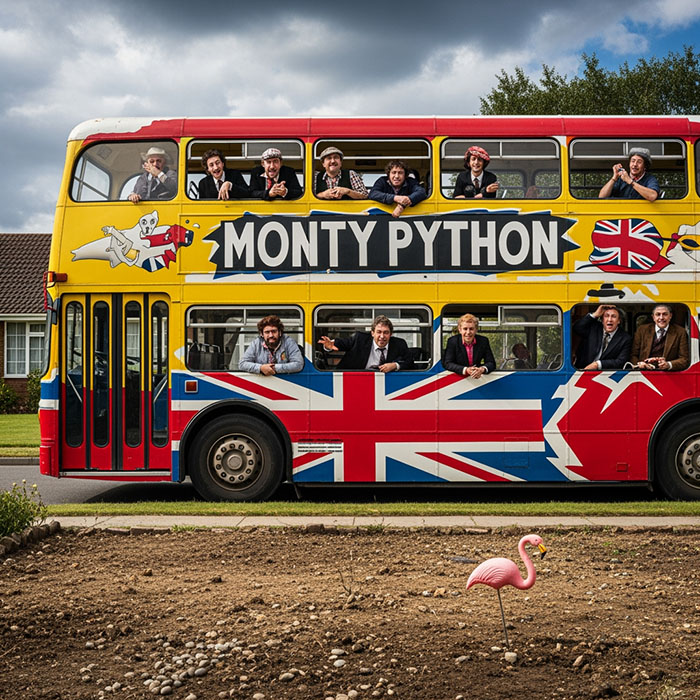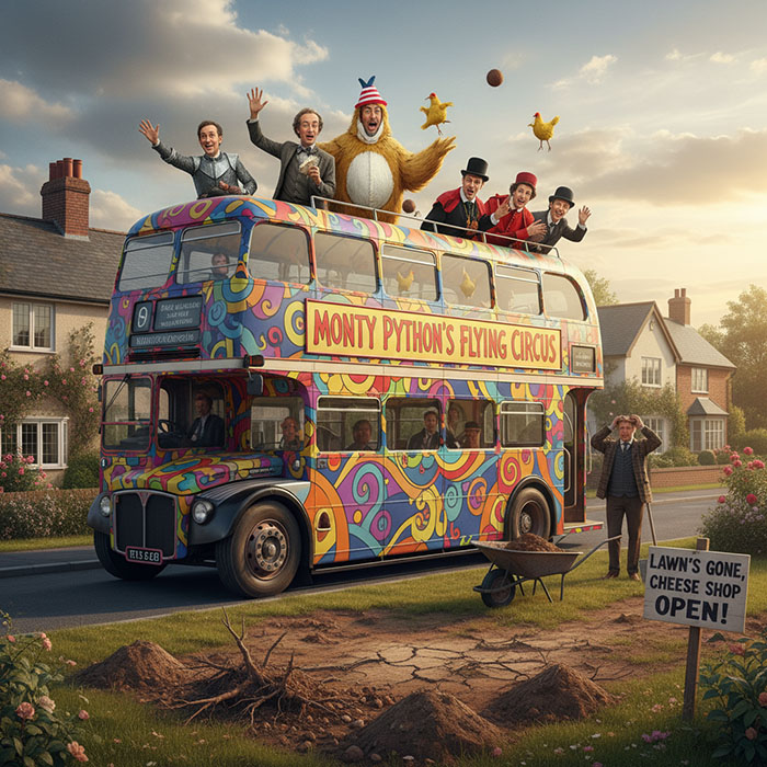 I was coming home on a bus with John Cleese and I think Terry Jones, and the bus was heading to my house, to the surprise of some people who didn’t know I knew the Pythons. But I had just been talking about Michael Palin and Great-Uncle Harry, and noted to the guys as well that the reason the boulevard was had irregular lengths of grass was because Eric Idle and Terry Jones had been giving the gardener nonsensical directions. When we got to the house I was surprised to see that the grass had all been removed. AI Prompt: A bus full of Monty Python members going past a yard whose grass has all been removed Imogen model: