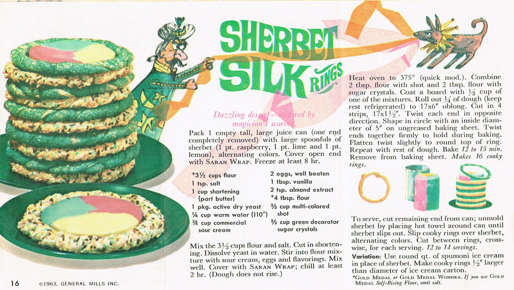 This is the most complex and incomprehensible thing I've ever seen. Alternating layers of cooky and sherbet, so you have about 45 seconds to serve it before it melts, loses structural integrity, falls over in a heap of multicolored stuff which, admittedly, isn't bad, because it's full of sugar. Just chop it up and eat it. No one cares what it was supposed to be.