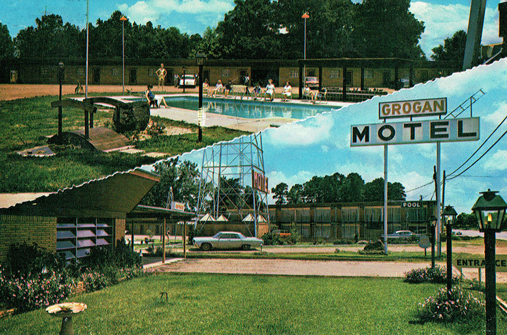 A card from the Mysterious ANK. He said that the local paper said the motel was incorporated in 1956 "by three members of the Grogan family." You can tell who swung the most weight.