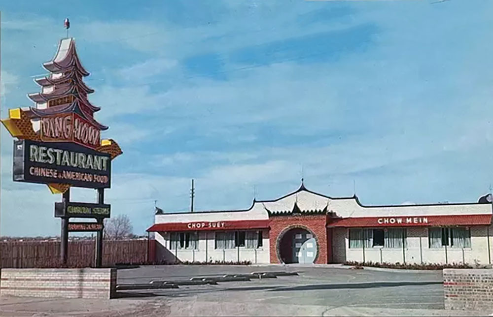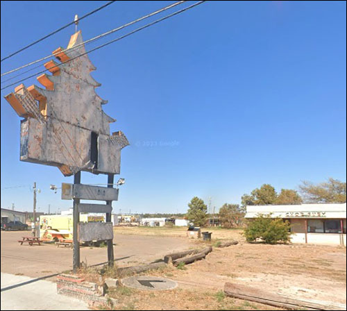 A Route 66 restaurant from the Baoque era of Chinese restaurant signage. Google Street View shows the sign in poor condition since the days when the cars first rolled through.