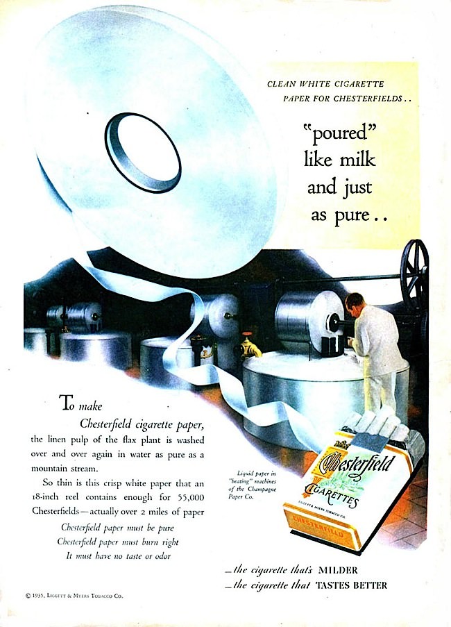 When you're bored pitching the virtues of your tobacco, why not change the subject to the quality of your paper? No one ever thinks about the paper. No one ever thinks "man, I'd really love to inhale some paper now, just to calm my nerves."