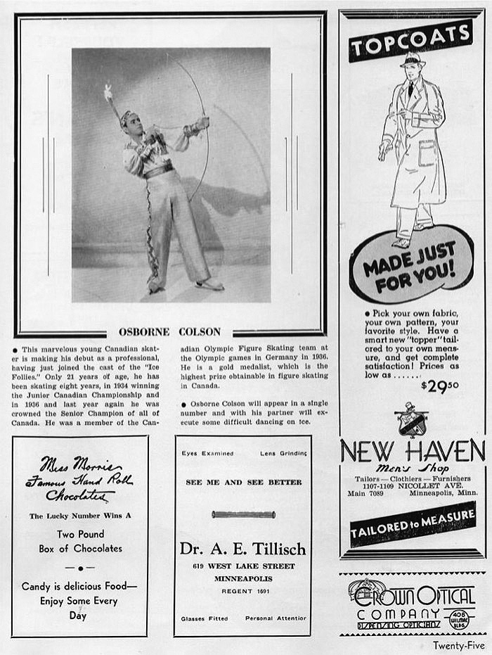The logos for New Haven and Crown Optical are perfect pieces of late 30 style. but it seems odd to have such tiny writing for an eye doctor. The address is 408 Wilmac Building, which I guess people were supposed to know was on Nicollet. |