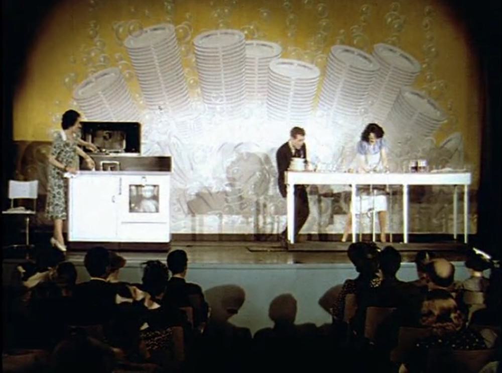We see a demonstration of the benefits of electrical dishwashing machines, which every house will have after the war! Yes, question from the audience.