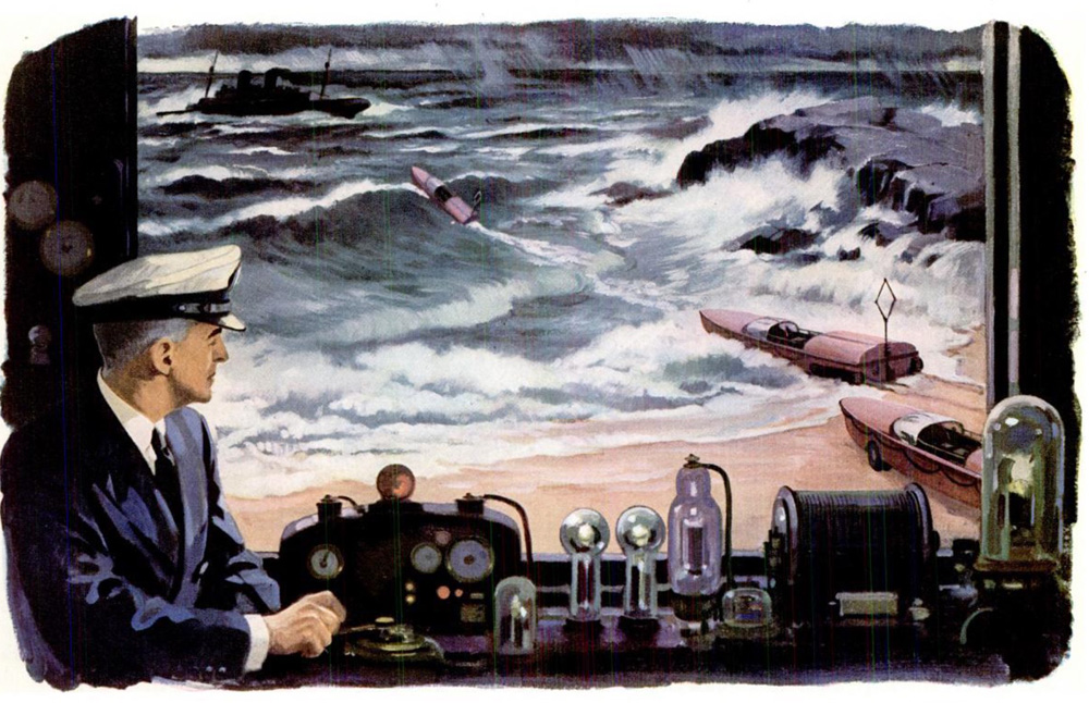 Drones, the early years. This isn't a bad idea, but it's really easier - and smarter - to put a human on board, since he can react to complications better and more quicker than Captain Lubber sitting back at the home office, looking at the TV screen. |