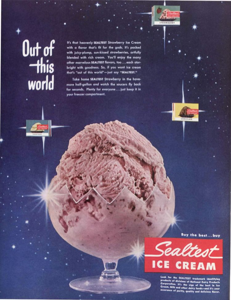 The space age would affect every single product, and ice cream was no exception. But the copy isn’t very scientific: “It’s that heavenly SEALTEST Strawberry Ice Cream with a flavor that’s fit for the gods.”