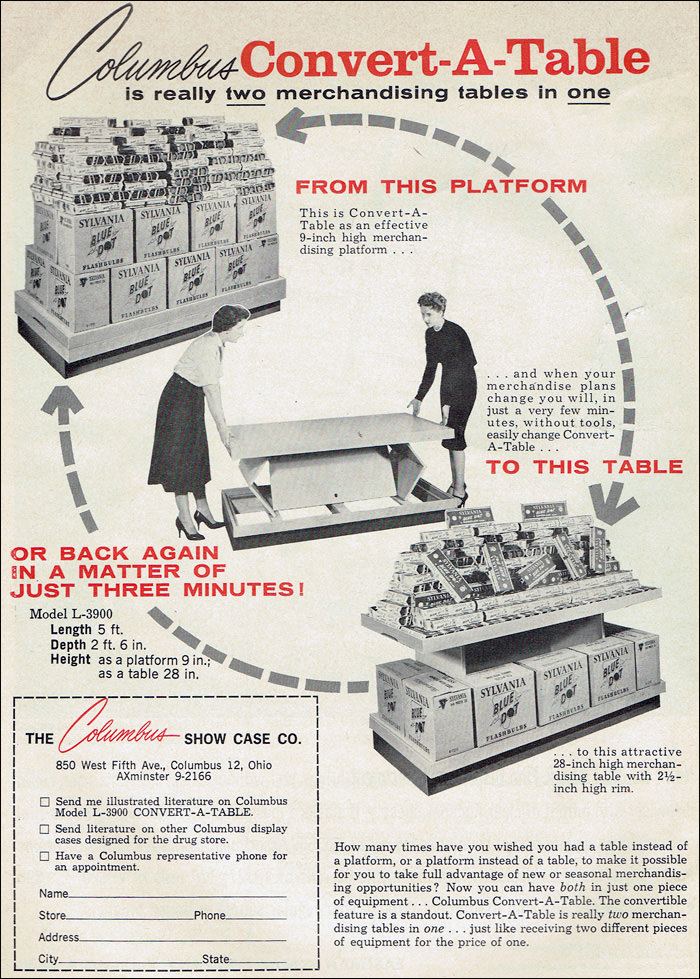 The famed Columbus Covert-A-Table took only three minutes to go from an attractive, two-tier display to a pallet that sat in the aisles like the Rock of Friggin' Gibraltar.