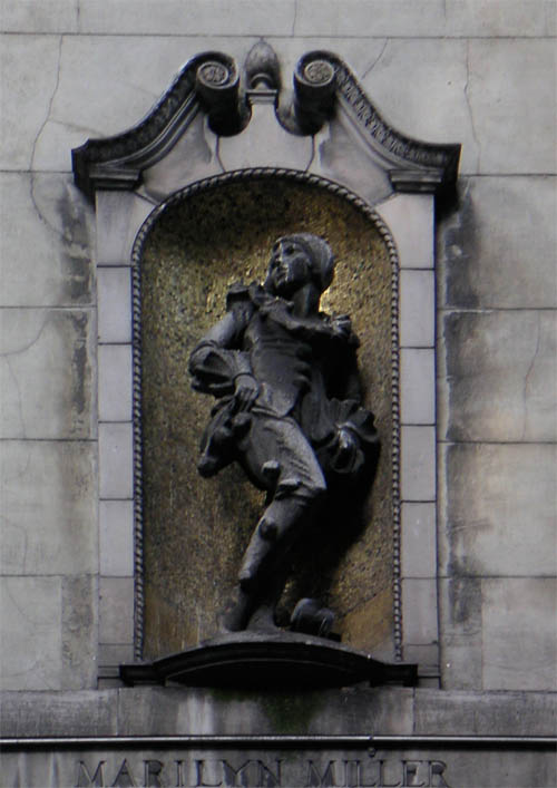 Well, famous in the 20s, anyway. Marilyn Miller, shown on the left (author's photo c. 2003) was one of the most popular Broadway stars of her time. She died in 1936 from complications following . . . nasal surgery. But she's immortal now; the building has landmark status and the statues were removed in 2012 for cleaning and repair.