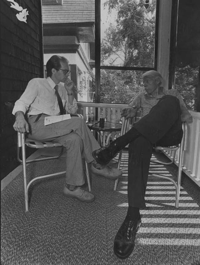 In college I joined the Minnesota Daily, a 50,000-circulation paper. I wrote a column for years, was opinion page editor for a year, books co-editor for another. Here I'm looking very Serious and Journalistic as I interview Daily alum Harrison Salisbury on the porch of his Minneapolis relative.
