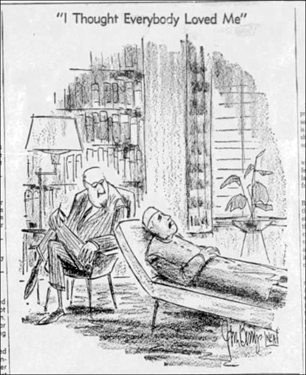 The artist has a New Yorker style, unlike most of the other political cartoonists. It’s Jim Berry, who ended up doing the Berry’s World one-panel comic.The WaPo obit noted that a passing reference to Scientology infuriated L. Ron, and hoo boy, this site says it has the Scientology memo launching their revenge: Operation Funny Bone.