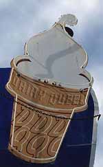 On the way home we decided to have that All-American Treat, Dairy Queen. The nearest DQ is a classic late 50s model with the original blue-and-white sign, one of those small urban details that survived by accident, and is now the subject of veneration by your host. Its like an embassy for the Nation of Summer. Inside its about 52 degrees; hot dogs roll on their organ-meat treadmill, kids sit on the sill working on ice-cream aneurisms. Nothing changes; nothing should.