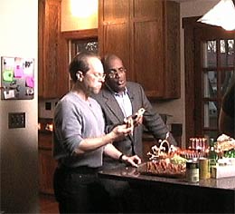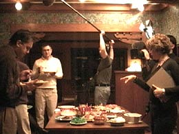 When we cut from this long long take, the producer just exploded with relief, really, because up until then we didnt know if we had anything. We had a lot of bad food. We had a trip to the supermarket to buy Lard and Suet and canned spinach and other types of heave-ho gorge bothering foodstuffs; we had FOUR FARGIN' HOURS of cooking in the kitchen to make this crap. But the interview cinched the bit. Then we had to do it again, for reaction shots and different angles and close-ups, and this time I gave different answers to all the questions and this led to more shtick. Believe me, youll see what I mean when this thing airs next June; watch for the Simultaneous Maniacal Laughter segment. The cameras werent running when we did the Monty Python Spam Song at the top of our lungs, alas.