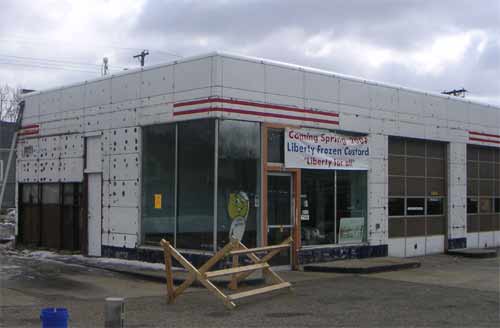 I mentioned this place a while ago, and it's a testament to the continual contrusion of this site that I can't recall whether I posted these pictures. Anyway - it's a classic old Standard station from the late 50s / early 60s. The owners have wisely peeled off the wooden bric-a-crap encrustrations that smothered the structure in the 70s, and are returning the building to its original glory - as a custard store!