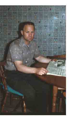 Later. Home. Feeling odd all night; tired and a bit schmozzled. It may be the weather, with is just bitchtastically vile (snow I can take. Snow I welcome and celebrate. But this is just vacant molar-acheing cold with wind, and has nothing to recommend it.) After the office I went to the grocery store, since I had to pick up ingredients for Gnat’s Girl Scouts assignment: popcorn balls. The most enduringly inedible of all seasonal treats. (Fruitcake is not a treat.) I went home, took a sweet little nap for 20 mintues, got up, made supper, and was clearing the table when I noted the recipe list for popcorn balls, and remembered: I hadn’t gotten the ingredients. I’d gotten everything but. So I ran back to the grocery store, got the stuff, headed home, shivering and cussing. Spent the night scanning more slides. Here’s Dad at the kitchen table, photographed for reasons uncertain; maybe he had come down with a case of Chameolinitis and was starting to blend into the wallpaper again. He has a newspaper in his hand; what does it say? Surely it’s the announcement that the Rose Petal Parade will now be daily at noon; milk will be free, and a bar of gold passed out to all heads of households on the first of the month.