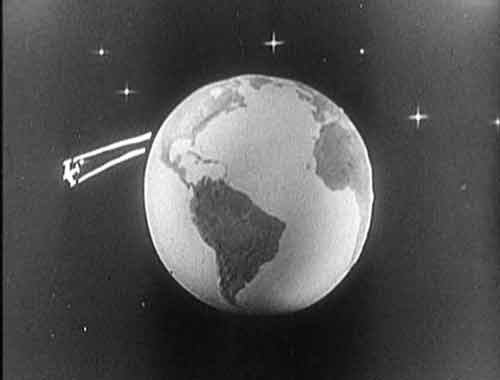 Instead, we’ll consider the commercials. The second disk has a few spots that accompanied the show, and as you might expect I found them fascinating, for all the usual reasons (glimpses into the everyday nature of post-war life, examples of cheerful MadAv soft-sell and 50s graphic arts, and so on.) In particular, I (heart) Space-lust, the fifties-era fascination with the inky beyond and the miracles of technology. These ads show how much the advertising industry was besotted by the emotive power of futuristic high tech. In the future, jets will fly in outer space!