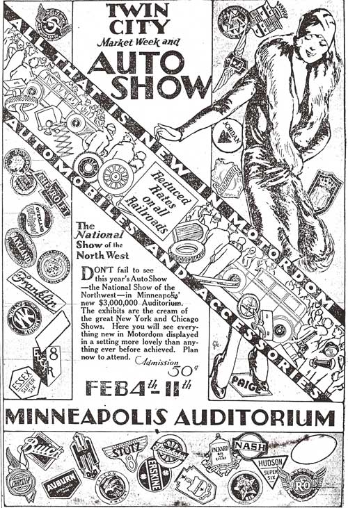 Let’s have an old ad. I used this illustration from the 1927 Minneapolis Auto Show. Many brands, few of which remain. A flapper to make it sexy: