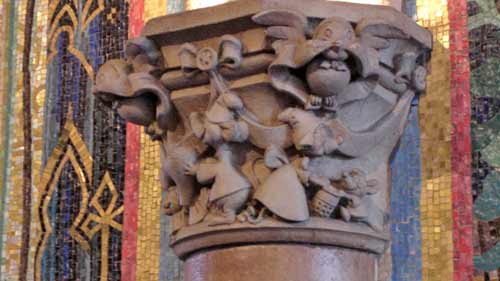 Sometimes the ersatz historicism – say that three times quickly, and you’ll get a degree - has whimsy, as in the capitals inside the castle. Adding to Doric, Ionic and Corinthian, we have Bibbitybobbitian: