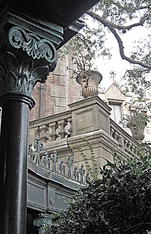 (Photoshopped that one up a bit. In fact I've photoshopped most of these one way or the other, and if anyone wants to complain that I've destroyed the essential integrity of the Disney experience, go right ahead.) The architecture of the Haunted Mansion is close to the architecture of Main Street, but more severe, and also more American. Main Street is Second Empire, i.e. French; the Mansion is Colonial Revival-meets-Gothic-in-a Greek-Revival-Quarry. Whatever you chose to call it, the style is now the preferred semiotic signifier for horror, decay, and romantic corruption.