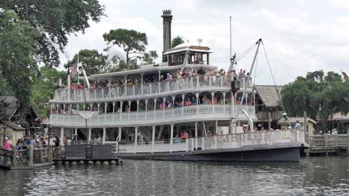 Off to Adventureland where, among other things, we visited Tom Sawyer’s Island, accessible by a 47-second boat ride. Went down a mine shaft, crossed a floating bridge, and found a veranda where one could buy a Coke and sit in the shade in rocking chairs and watch the paddleboat thrash past.