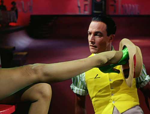 That’s a striptease segment. She removes one glove. If she’d taken off the other one they would have shut down the production for reasons of Unbearable Insinuation. Even now you can hear propane tanks explode down the street if you watch the scene with the curtains open. What really makes the film peculiar, though, is the sexual vibe between the two guys competing for her attention. In case you’re wondering if one was good and one was bad, the lighting helps:
