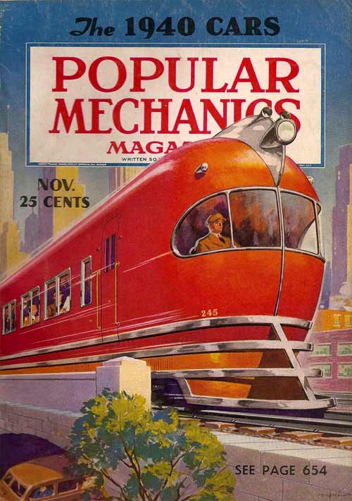 It appears to be driven by a manniken, just to show how automated and modern trains had become. They hadn't come up with by '39, but they were close. Think of seeing this speed by as you waited at a crossing in the middle of Nebraska: all your life you’d thought of trains as black ungainly beasts, and now, for a minute, the future screams past, looking like something you saw in the Buck Rogers serial. It would be like going to the airport in 1977 and seeing the Millennium Falcon.