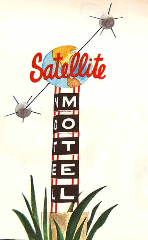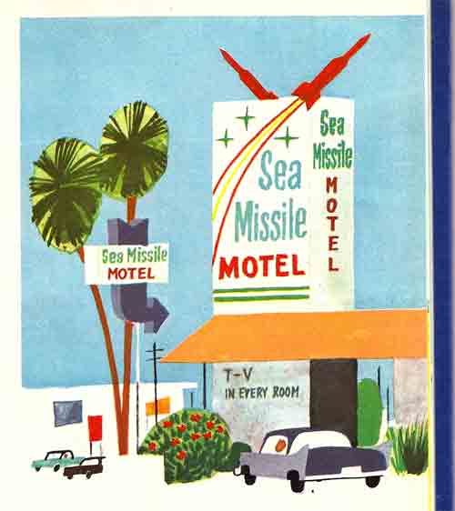 The idea is cute enough – vacationing kid walking out with a cone under that proud and noble sentiment – but it just looks as if the artist couldn’t do any better. I bought the book because it had some pictures of Cocoa Beach motels: