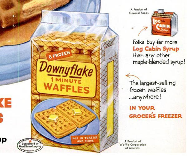 Downyflakes were sold to Pet, and then to Pillsbury here in the Twin Cities. Pillsbury went about changing the brand to Hungry Jack; first they called them “Downyflake from Hungry Jack,” which must have stung the Downyflake partisans. Hungry Jack was the newcomer. It should have been the other way around, dammit. It’s not right. Eventually Hungry Jack went out of the frozen waffles business, and that was that.