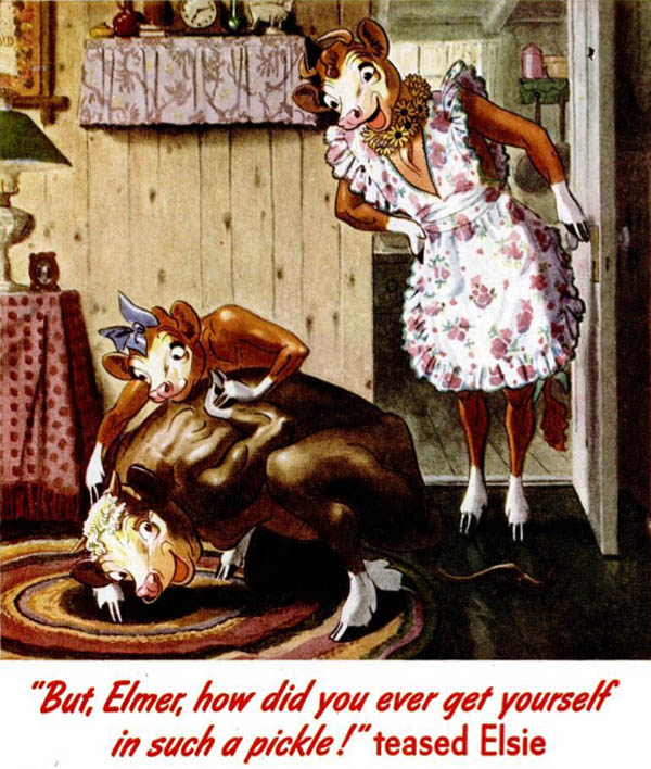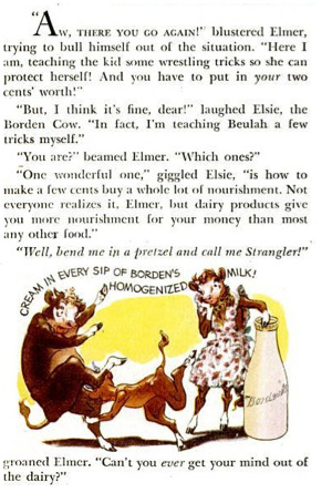 Then, as the text reveals, he’s immediately grumpy again, since Elsie spoiled some roughhousing with Beaulah. He also expresses his dismay that she can’t go 30 seconds without rubbing her Borden money in his face, and coins a phrase I think we all can understand: get your mind out of the dairy.