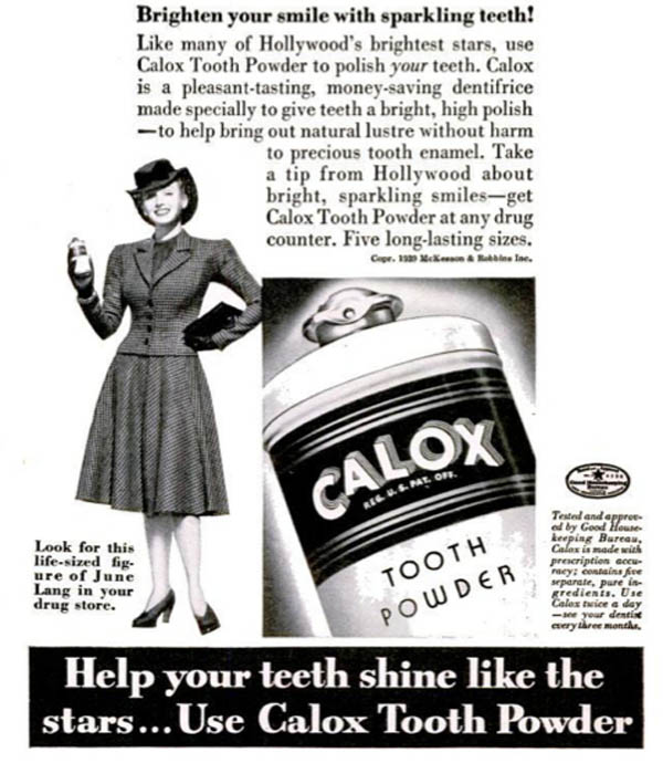Before toothpaste, I gather, there was tooth powder. Calox used famous actress June Lang . . . hold on, no, I don’t know who she is, either.