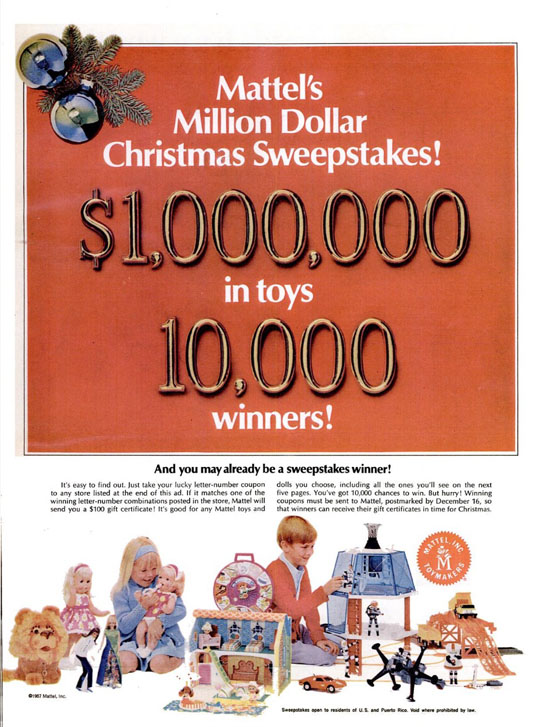 Here's an ad that left you with mixed emotions. On one hand, it would be cool to get a million dollars! Wait a minute, that's a million dollars in toys. That's different. Maybe you coul sell them. Wait a minute, 10,000 winners? So they were giving away 10,000 million dollars? In toys? No, the million was split up among 10,000 winners. Eh. Hardly worth the trouble entering.