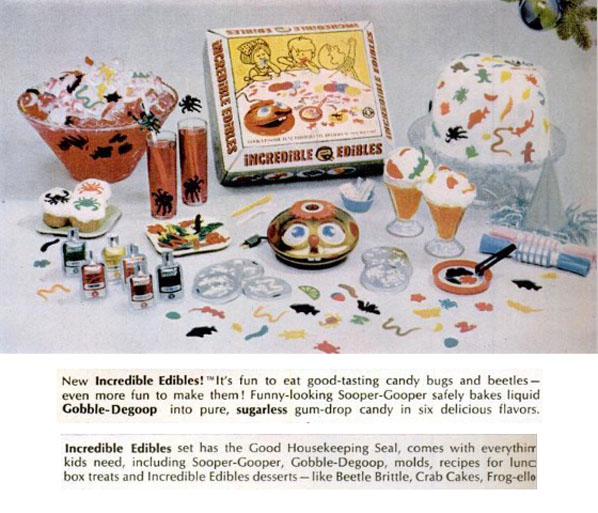 At the same time Creepy Crawlers were marketed, Mattel came up with the Incredible Edibles - same thing, in a way, except that they could be consumed, broken down by stomach acids, metabolized and excreted, as opposed to passing intact through your digestive system.