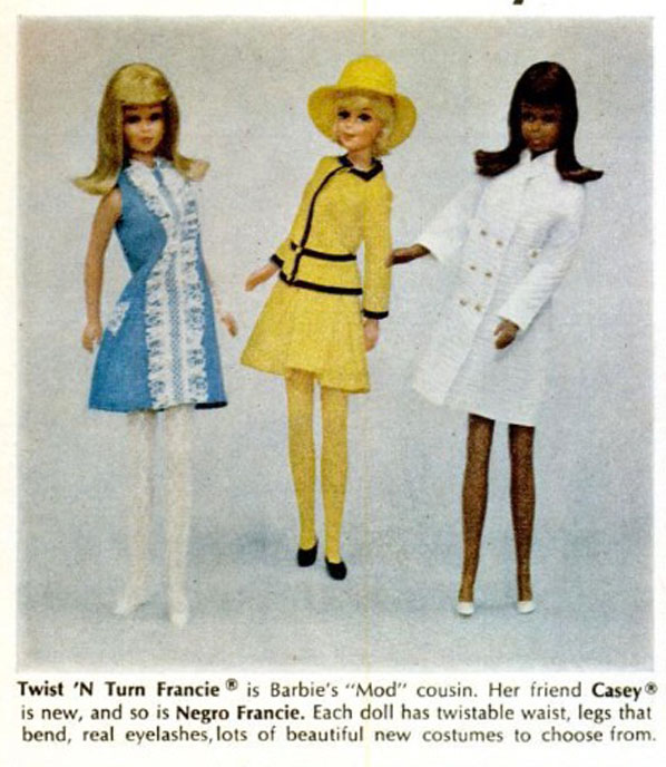Interesting that they made the distinction that her friend Casey is new, and so is NEGRO FRANCIE. Although I suppose NEGRO FRANCIE couldn't be Francie's friend, being her doppelganger, but did that mean NEGRO FRANCIE was from an alternate world in which Barbie was always Black, or did Barbie have a Black Uncle?