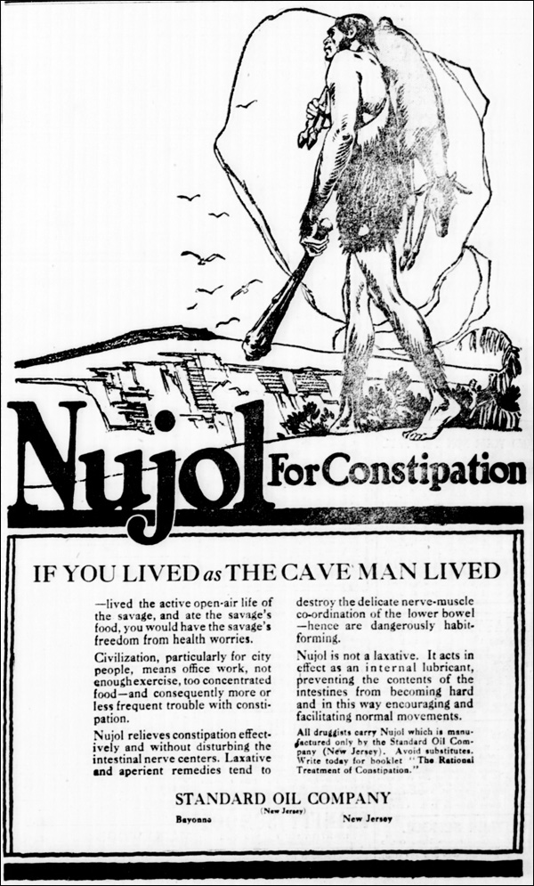 It’s a good article - more interesting than this one - and while it suffers from the usual womansplaining about how men think (kidding; somewhat) it reminds us that people in the early 20th century were convinced that the mad pell-mell rush of modern life was stripping away our Vital Essences. I see it in the ads all the time: this modern world, with its clattering typewriters and jangling phones, took a toll. Those were “the forces threatening him,” not paparazzi or dusky hordes of immigrants or gender-theory studies majors. A good outing in the clean restorative countryside - a vacation, or just a motorcar jaunt - would help. If you really wanted to take the cure, you went out into the woods and did Manly Things. And then you moved your bowels. Finally!