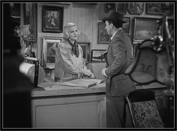 He's mysterious! He also has a lot of hat. He, too, is looking for the jewels. He says he’s waiting for Miss Whatsername, the Blonde, who is due to come by the art supply store in the waterfront district at 8:30 at night. And sure enough, she appears.