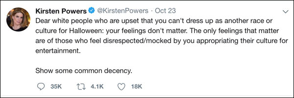 My point isn’t that people should wear redface or put on sombreros and say ay yi yi Frito Bandito style. It’s the idea that A) our betters feel the need to lecture the rest of us idiots, and B) everyone is being herded into “lanes” as if culture is a bowling alley instead of a rugby scrum. Cultural appropriation is nonsense, for the most part, and the people policing this stuff are obsessed with race. History is just a box of LEGOs they can assemble as they please, and the future they want is one where I hear “dear white people” and I' supposed to think they’re talking about me.