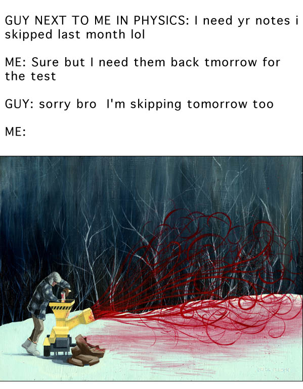 Also: before we get too prim, putting out a picture of people fed to a woodchopper for a social drime is permissible if you're in high school, and you're joking. I mean, tweet that picture with the caption: