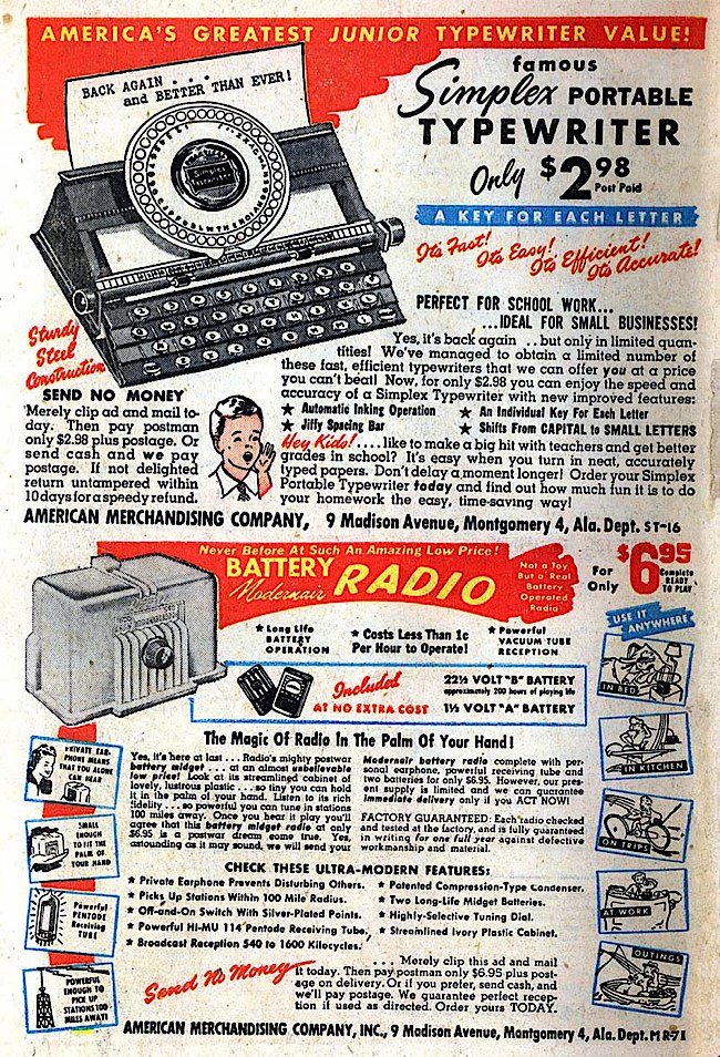 A key for each letter, eh? Bet you could type up to 60 wpd (words per day) on that thing. The copy on the radio makes me mist up a little: this tiny plastic radio is "A postwar dream come true." In a way I'm sure it was - no consumer goods, the promise of cool futuristic technology - developed by the Army! - after the war was done. I mean, look that feature list. An OFF-AND-ON SWITCH? This is Buck Rogers stuff, friend. |