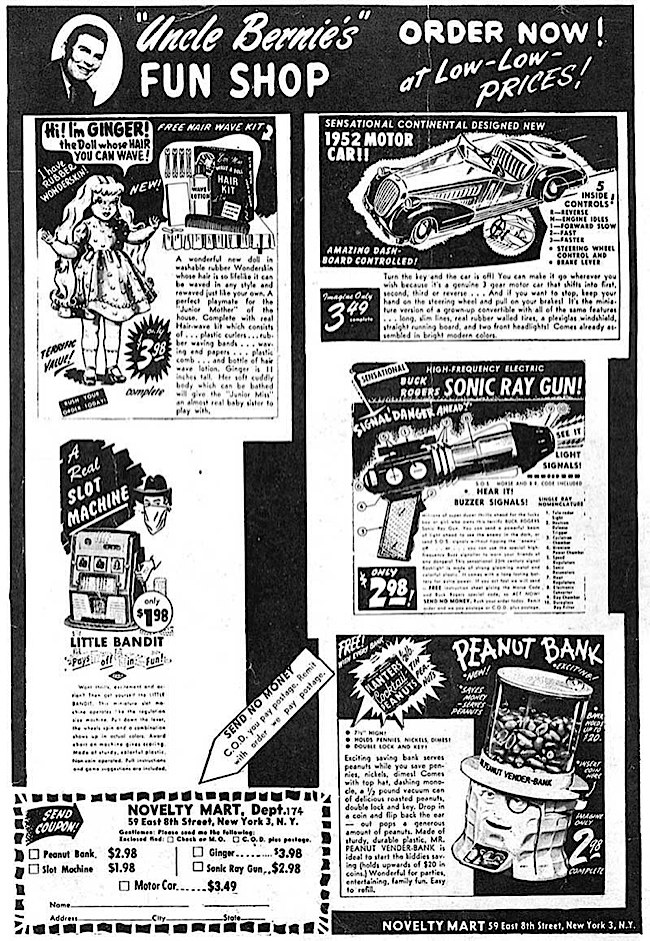 He's back! Your "Uncle" Bernie is still pimping the Rubber Wonderskin Ginger doll, but now he's added a "Buck Rogers" ray-gun and a hideous mutated Mr. Peanut who looks like a brutish sexual deviant. Heh heh heh scoop out my drawer heh heh