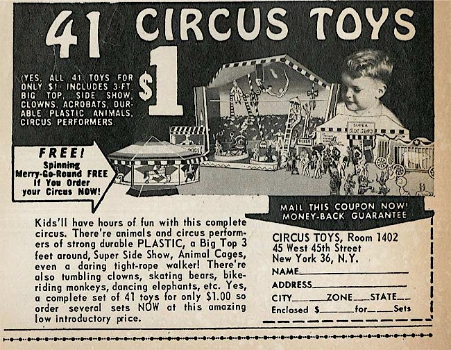 Order several sets, so you can set up competing circuses, and have the roustabouts sabotage the other ones to simulate the cut-throat world of itinerant amusement organizations! Fray important tightropes, open animal cages, ply rival clowns with poisonous liquor! Hours of fun! |