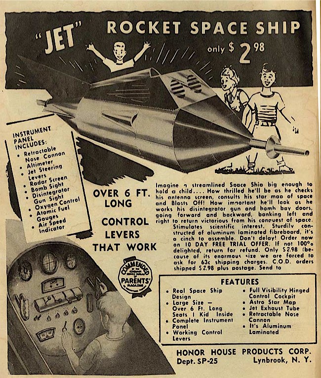 Ah, the golden age: "How important he'll look as he works his disintegrator gun and bomb bay doors." How I wanted one of these when I was a kid. I didn't care if it was cardboard. To have something like this was a great improvement over the rocket ship I made, which consisted of a lawn chair and a car battery. |