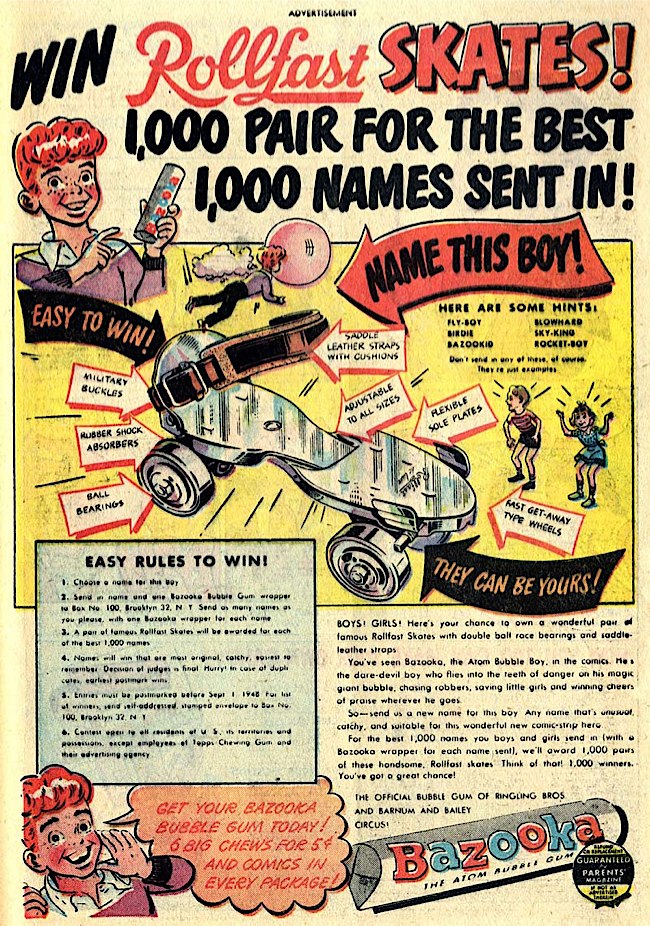 Here we realize that Bazooka Joe was thiiis close to being named "Blowhard." And here we also realize, with regret, that the gum's no longer known as the "Atom Bubble Gum." Whatever that meant. All bubble-gum contains atoms. Remarkable the FTC didn't get on their case for that one.