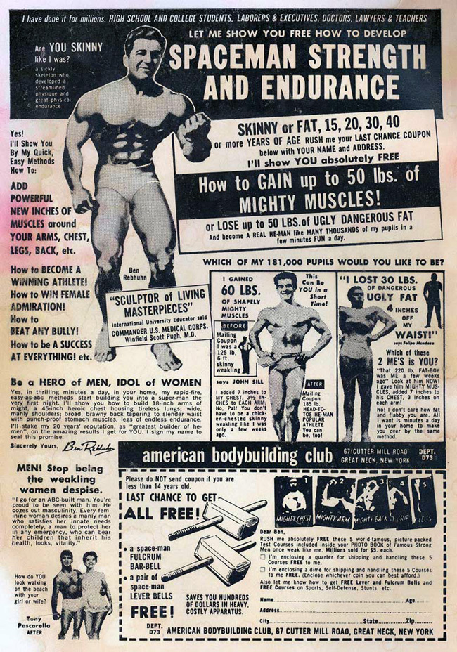 Yikes. Well, at least this guy worked the quads; not one of those house-on-stilts you see in other ads. Still looks like he’s turning into a crab, and I’m surprised the science of the day was capable of implanting canned hams in people’s fists.