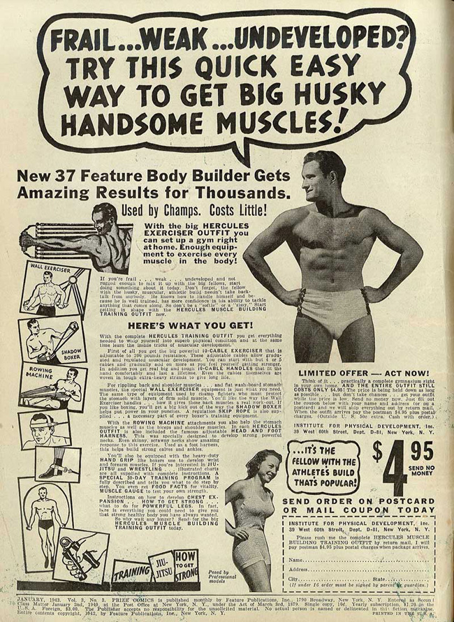 The exercise suggestion beneath “rowing machine” looks like some sort of medieval torture device. Send no money! We’ll bill you later, because we know if you order this thing you’re not the sort to give us trouble about paying. Because you’re Frail, Weak, and Underdeveloped, and wouldn’t want to admit you couldn’t even do one set of exercises without having the springs snap in your face and take out a tooth. |