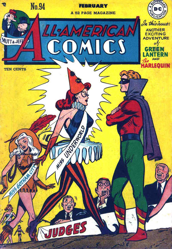 The purplish cape and red shirt and yellow-trimmed socks are your immediate clues that this is the Green Lantern. The old Green Lantern, not the green-and-black one. Harley's got that sexy-librarian thing going for her, but you have to wonder about the wisdom of showing up at a beauty pageant as "Miss Underworld." You're not going to win, because there's no way they can be sure you'll make all your personal appearances. And if you do, you'll steal silverware on the way out. The authorities could easily follow her back to her Lair, too, and bust the Henchmen. No, it's better to go with Miss Gotham City. Ingenous outfit, but you could imagine her primping the night before and thinking, well, the incredibly short shirt and cleavage-port should do it, and dying my hair white is a nice youch, and the Mme. Pompadour beauty mark is a nice nod to 18th century conventions, but it needs something else. Like a blood-red feather from a freakishly large bird.
