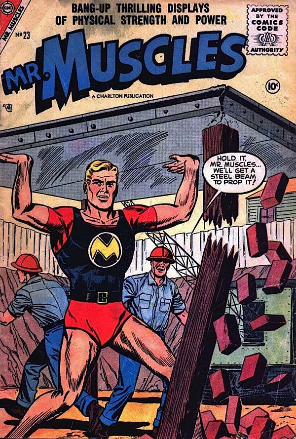 What is he holding up, anyway? And how can he keep that poorly-drawn object from falling over on Hardhat #1’s head? Why doesn’t he wear pants? Is his last name really Muscles, and if so, what’s his first name? Can't be Frankie, because that would sound like a Gambino enforcer. Pity him if it's Adolph.