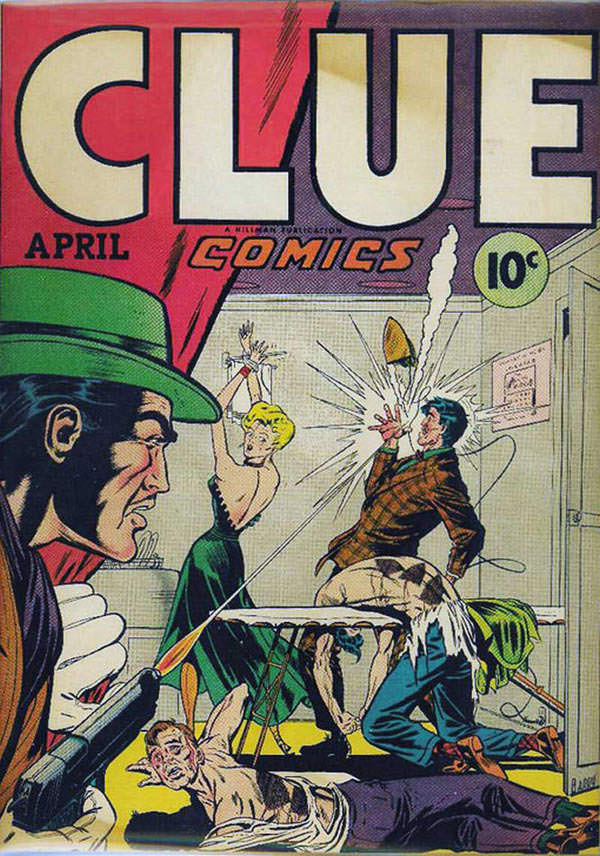 When they talked about the sadism in children's "funny books," I suspect they had this in mind. Not only sadism, but bad physics. Not sure the angle of the gun is correct, and I doubt that shooting an iron made it fly up as though shot from a cannon. Also unsure whether a flimsy towel rack could hold a dame, especially if she was writhing in terror. As for the black marks on the fellows' backs, it certainly looks painful, but how did he get them to sit still for that? Here, lie across this ironing board. Your back is wrinkled. And shouldn't the ironing marks go the other way?