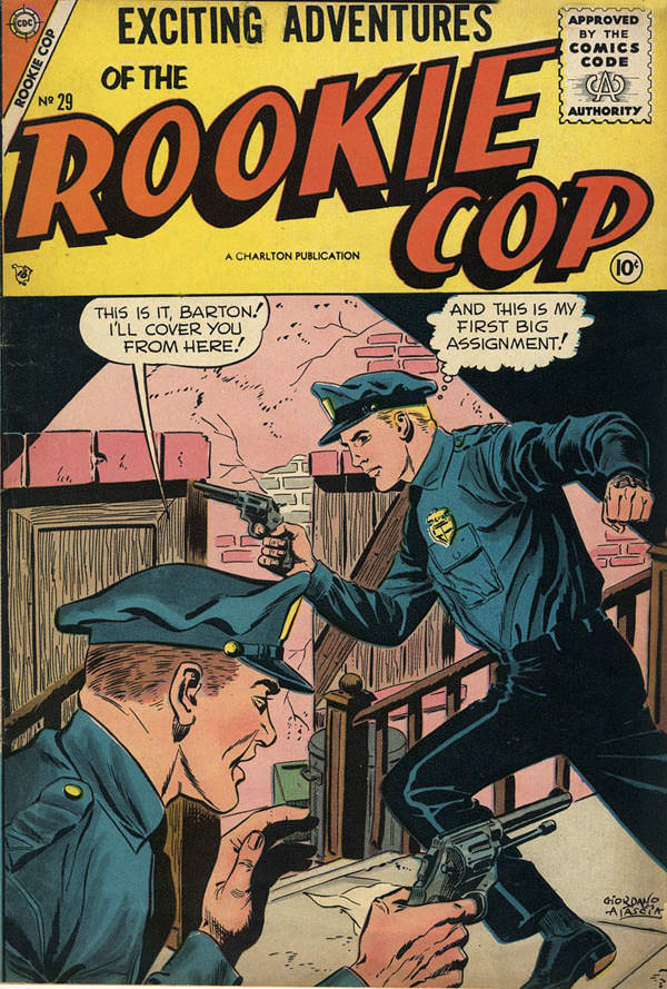 Adventures of THE rookie cop, right? So Levitating Fella, the Anti-Grav Policeman, is THE Rookie Cop? And this is issue 29. And this is his first big assignment. One suspects he'd really gotten on everyone's nerves in the previous escapades, and this was a Serpico-like set-up. "Oh, yeah, sure, I'll cover you, standing back here behind you as you go down the alley and through the door. Plus, have you noticed I'm blind? Go get 'em, Tiger." |