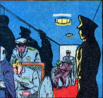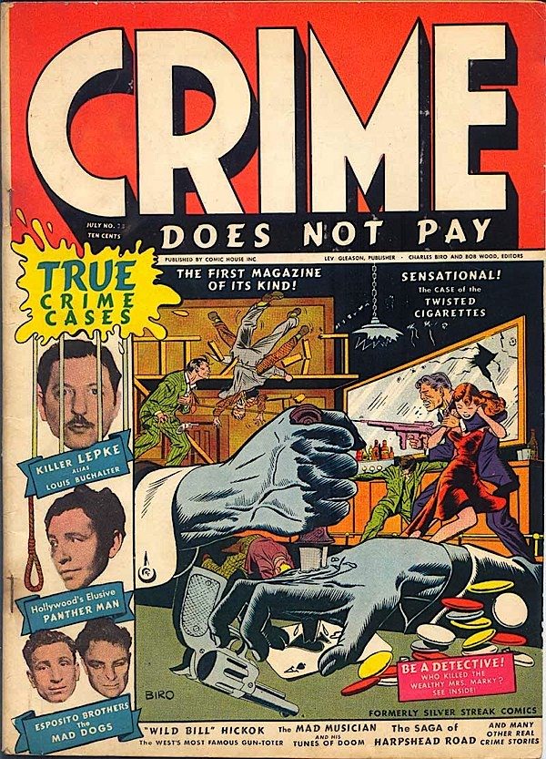If you’re wondering why they came up with a Comics Code to regulate funny books for the juvie market, here’s Exhibit A. The signature in the left hand corner says it all: that’s Charles Biro. (You can see the future work of Charles Burns in the shading, no?) There’s a great deal of odd mad violence in this bar room brawl. A man is shooting a Tommy gun with one hand – no recoil problems here – while he grabs a redhead with the other; the gun, a festive pink model, somehow shoots a guy in the background while pointed straight ahead. In the foreground, there's a bitter fight between two colloidal silver enthusiasts – one drops a 3/4 size revolver while his hand is stabbed with such force the blade penetrates it without pinning it to the table. In the background - well, it's hard to tell how the hell that happened. Or why all this mayhem should surround a case of twisted cigarettes.
