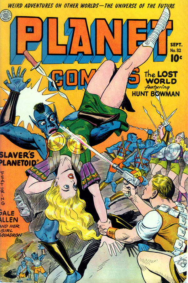 I presume that's Hunt Bowman, who appeared in enough comics to get his own wikipedia entry. He "lived on a future earth that had been conquered by the Voltamen"- but they had green skin, not blue, so those can't be Voltame. n