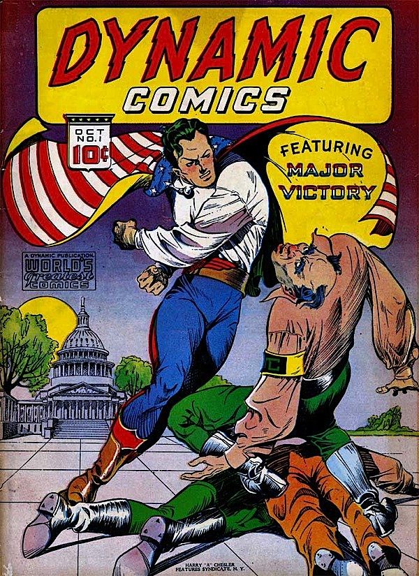 You’d think he would have chosen a more practical cape – one rip, and he has to burn it. Unless it’s made out of super-patriotic fabric that came from the magic loom of Betsy Ross, or something. There are many competing Major Victorys in comic book history; this fellow appears to be the first, and certainly the only one with a serious hunchback. He’s shown punching some odd Not-Nazi who has shown up in Washington with the tell-tale signs of an enemy of decency and democracy: he has an armband with a strange symbol, and he’s ugly. For all we know the guy was in town on a tour for the feeble-minded, and the armband served to identify him should he become separated from his group. Doesn’t matter! Pow! |